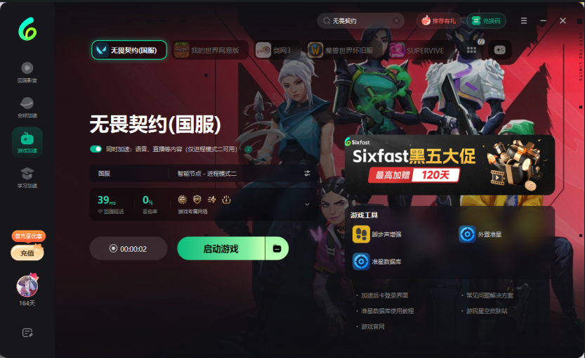 3、在Sixfast回国加速器内找到无畏契约国服,加速到100%就能解决上述问题了