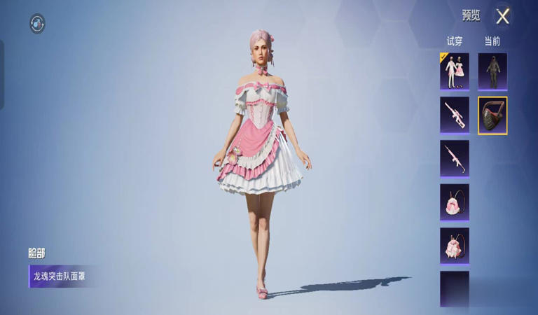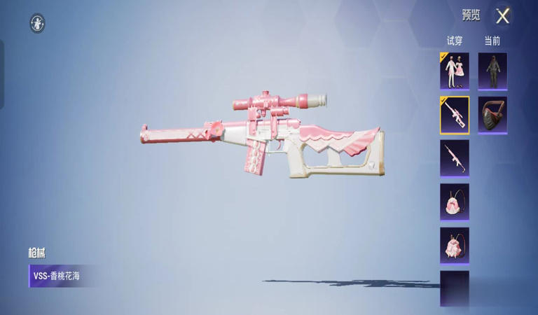 如图所示,这个新军需名为“香桃花海”,虽然仅有1个套装,但却拥有2个枪皮以及头盔、背包、挂件、降落伞等皮肤,在种类方面属于游戏中最为常见的“小转盘”。