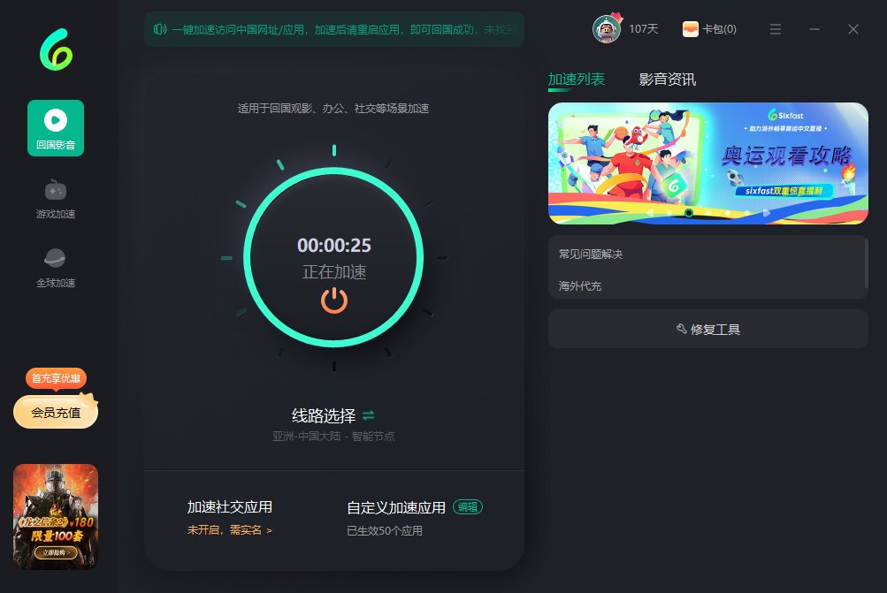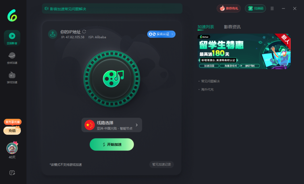 海外地区和国家的服务商不同,各地的区域调整政策不同,访问国内的网站出现无法打开是常有的事情,所以推荐各位用户使用sixfast,直接选择影音加速中一键加速就可以解决访问中国知网等各类国内学术网站的问题。