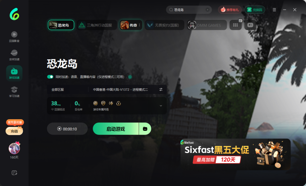 3、在Sixfast回国加速器内找到恐龙岛,加速到100%就能解决上述问题了