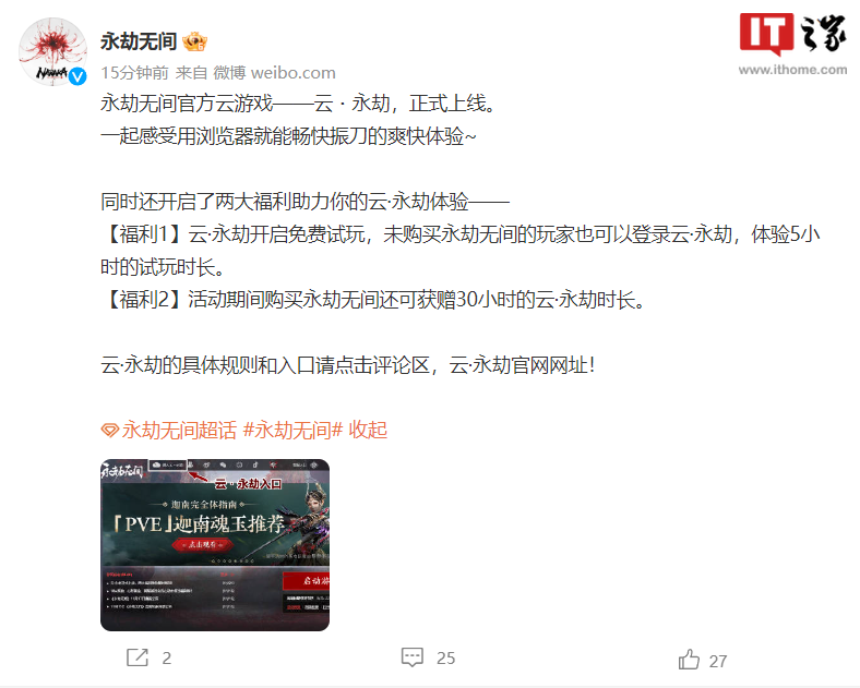 “云・永劫”目前可免费试玩,未购买《永劫无间》的玩家也可以登录“云・永劫”,体验 5 小时的试玩时长。活动期间购买《永劫无间》还可获赠 30 小时的“云・永劫”时长。