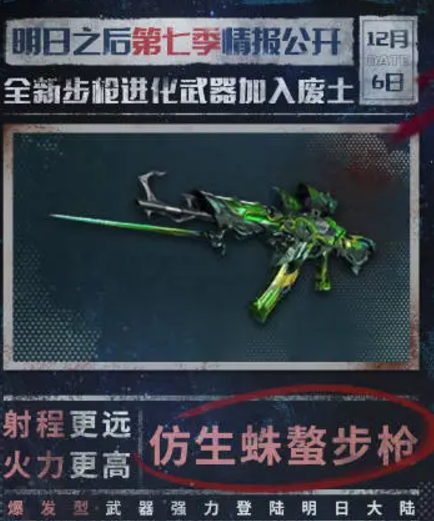 12月6日,全新步枪进化武器【仿生蛛螯步枪】加入废土! 仿生蛛螯步枪,拥有更远的射程,更强的火力输出,和更低的射速; 该武器对某种“虚弱”的特定目标造成伤害,可强化命中伤害;