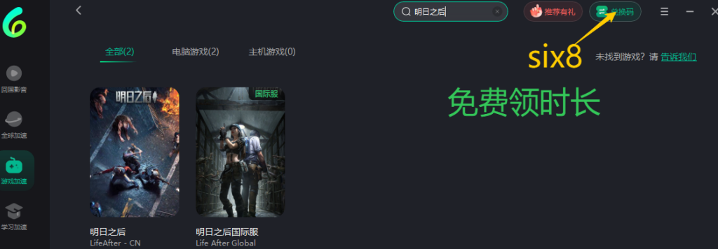 2.PC端进入:https://appupdate.sixfast2.com/official/pc/Sixfast_windows_683.exe 进行下载。按照提示登录注册,在会员中找到【兑换码】,使用【six8】先领取时长,也可以直接点击:https://www.sixfast.com/tg-exchange 按照下图所示填写兑换码【six8】领取时长。(支持手机和电脑)