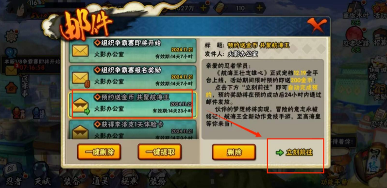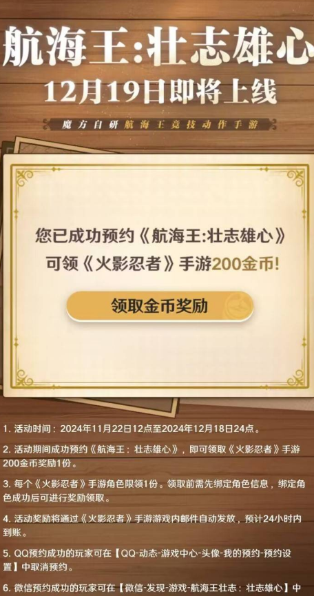 《火影忍者手游》开启了与《航海王壮志雄心》公测的联动,预约+兑换可以领取300金币。