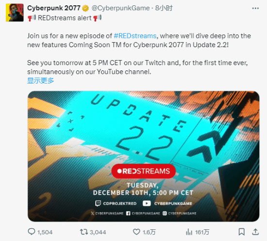 1.今日,CD PROJEKT RED官方惊喜宣布,将于当地时间12月10日推出新一期“REDstreams”直播节目,深入讨论《赛博朋克2077》全新2.2版本更新中即将推出的新功能。