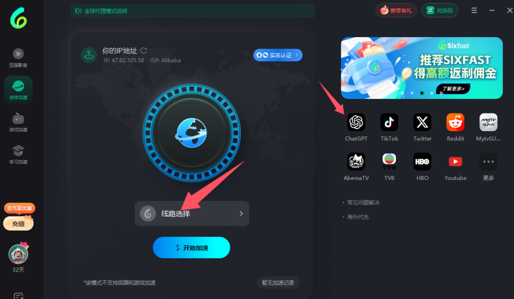 兑换完成之后搜索全球加速切换节点点击加速即可!