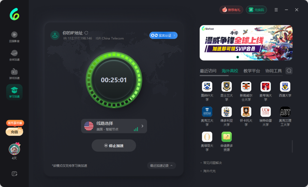 推荐使用Sixfast回国加速器,一键加速学校官网