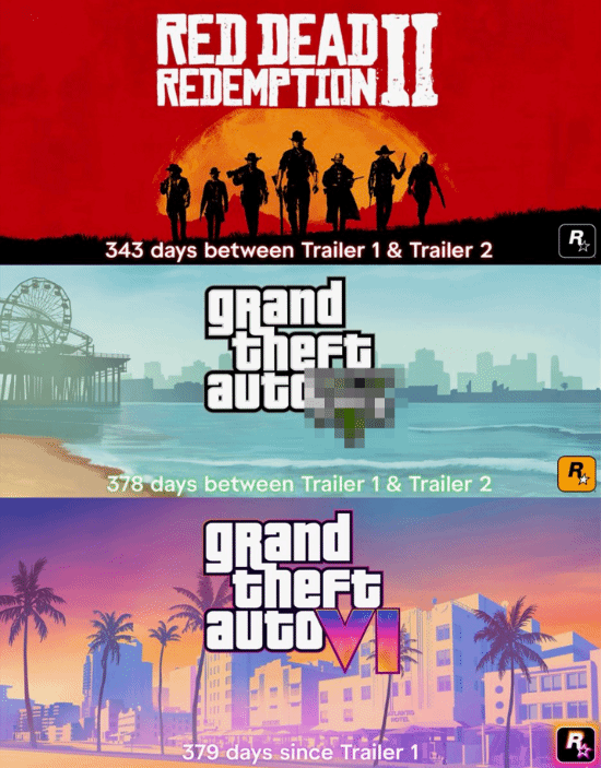 日前,推主@GTAVI_Countdown发推表示《GTA6》已经成为R星旗下最长时间没有新预告片的游戏,并列举了《荒野大镖客:救赎2》与《三男一狗》第一部和第二部预告片的发布间隔天数。可以看到,《GTA6》的间隔天数已经超过了《三男一狗》,且现在还在增加。