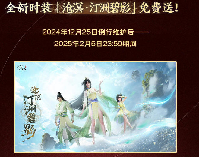 不过官方表示为了防止工作室刷金行为,未充值月卡的玩家将有部分交易相关功能会受到限制。而随着活动开始,官方还会免费送出名为“沧溟·汀州碧影”的全新时装,将持续到2025年2月5日23:59。