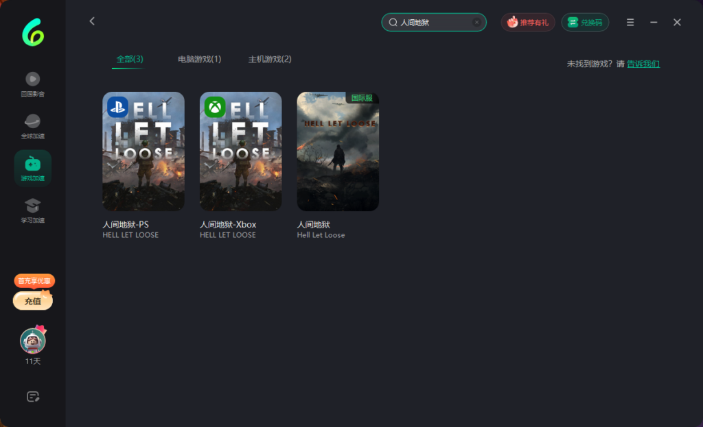 兑换完成之后打开sixfast搜索《人间地狱》点击加速即可游戏