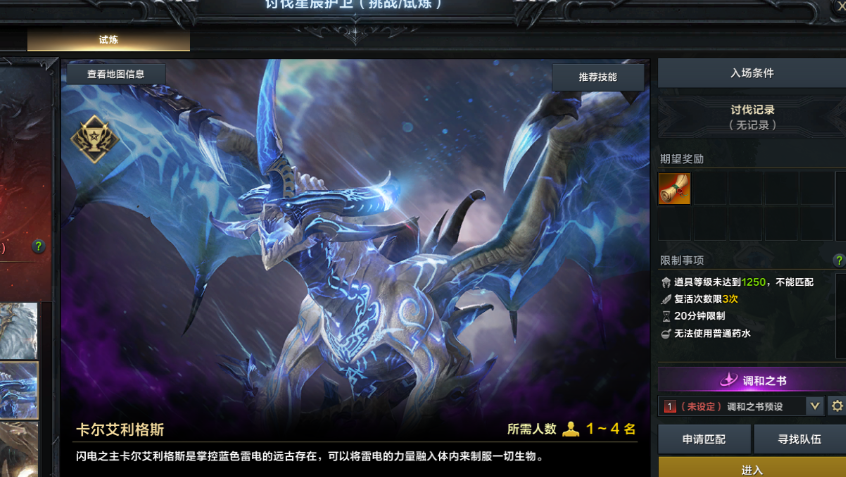 讨伐星辰护卫(试炼)卡尔艾利格斯开启,冒险家道具等级达到1250以上并有讨伐1阶段贝尔图斯记录即可挑战,需要设置【调和之书】后才能进行挑战。