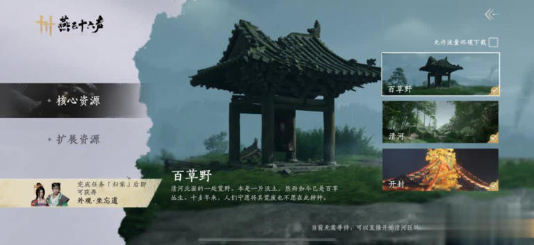 核心资源中包含了百草野、清河以及开封等地的诸多内容;而扩展资源中则包括了游戏中丰富的外观。在完成【归家】任务后,还能获得【坐忘道】这一外观,移动端的小伙伴们可不要错过啦!