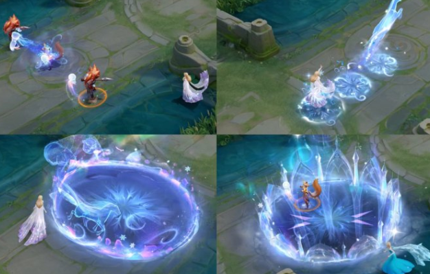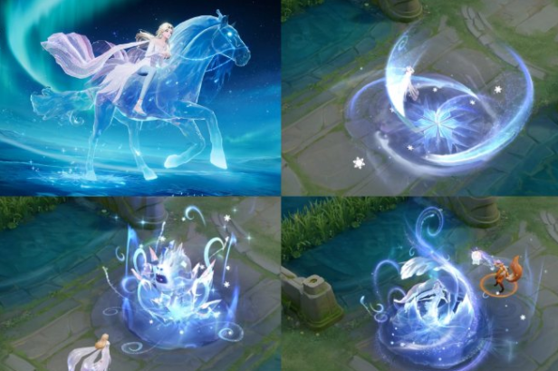 三技能:技能释放随机出现白裙和蓝裙2种状态和特效。白裙甄姬释出水马向前,所至之处地面冰阵显现,周围极光、冰雪卷纹若隐若现,电影中的火灵、水马、巨石人依次出现,极具奇幻色彩。再现《冰雪奇缘2》中元素精灵们在梦境中,向艾莎的召唤。甄姬变为蓝裙状态时,会持续一段时间,伴随冰雪魔法奔涌向前,冰雪建筑拔地而起,再现《冰雪奇缘1》中艾莎勇敢前行创造冰雪城堡的那一慕。