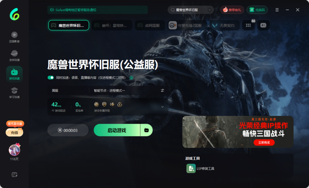 第二步:在Sixfast加速器中搜索魔兽世界怀旧服,点击相应图标,启动加速服务,国外就能正常玩游戏了