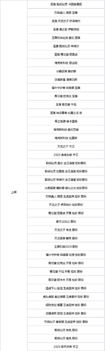 - 守卫(50 神话精粹):王国机神 2020 守卫、春节庆典 2023 守卫。