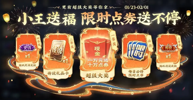 首先是限时点券活动,这也是很多玩家最期待的一个活动,从23号更新之后开始,到27号这段时间,玩家上线就可以领取288限时点券,23号到2月1号,玩家每天登陆游戏中都可以获得一次抽奖机会,抽奖必得20限时点券。除了限时点券之外,还有机会拿到万元现金十万点券或者永久皮肤等奖励。