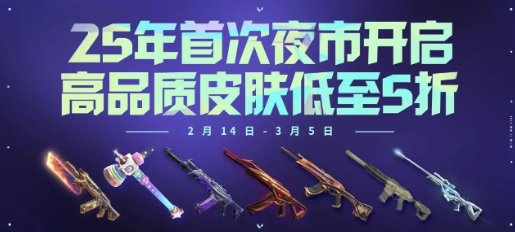 《无畏契约》2025 年 2 月 14 日开启的夜市是一场武器皮肤狂欢,持续至 3 月 5 日。具体介绍如下: