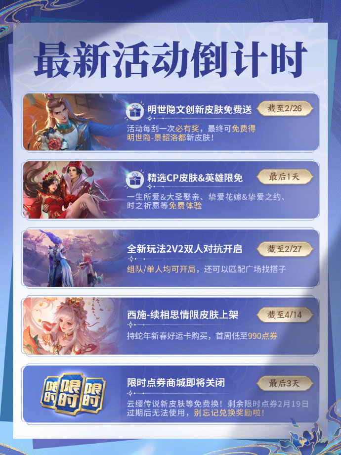 - 限时点券商城即将关闭:进入最后 3 天倒计时,剩余限时点券需在 2 月 19 日之前使用,过期后无法使用,提醒玩家及时兑换奖励,如云缨传说新皮肤等。限时点券商城的关闭提醒促使玩家合理利用手中的限时点券,兑换心仪的游戏道具。