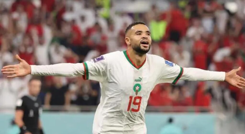摩洛哥队球员恩内斯里庆祝攻入球队第二球