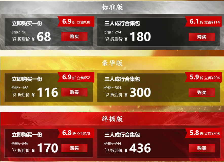 三个版本的价格分别为:69RMB、116RMB、170RMB。如果购买三人成行终极版的折扣可到5.8折,创下了历史最低价格。