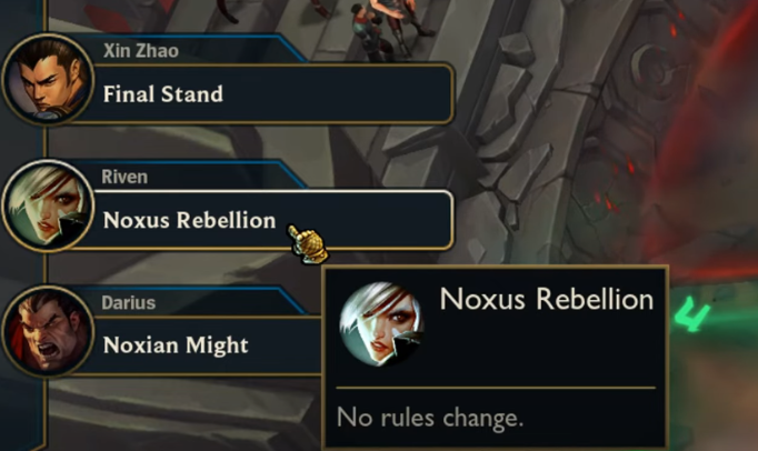 – 锐雯:锐雯是一个特殊英雄,可在第二回合或第八回合出现。选择锐雯不改变游戏规则。第二回合或第八回合。15.5版本。
