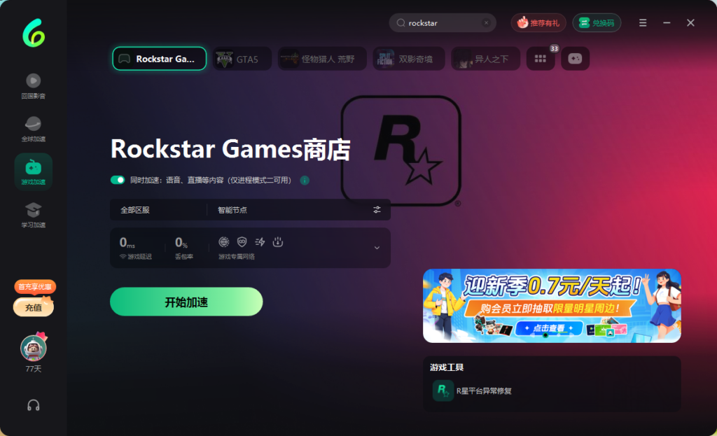 兑换完成之后搜索RockstarGames选择香港节点点击加速即可!