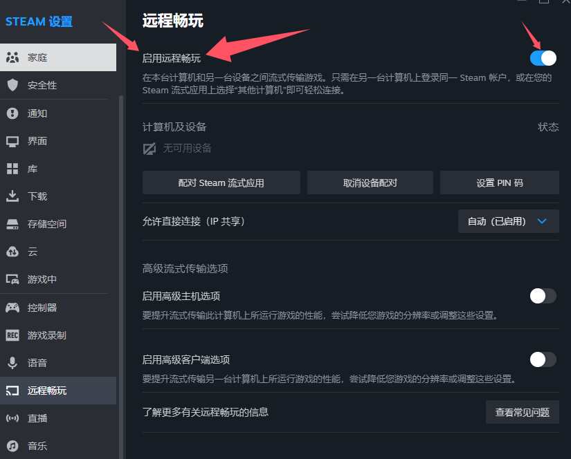 二、在steam设置里打开远程畅玩,两边都需要打开。