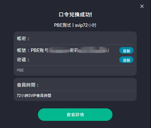之后在右上角兑换码出输入兑换码PBE1,就能获得加速时长的同时,领取到一个美测服的PBE账号