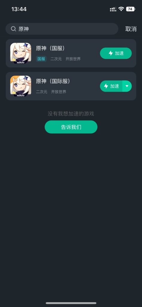 在sixfast中输入关键词 原神,就会出现原神国服的加速,点击加速按钮即可一键解决卡顿/延迟高/更新慢的问题,非常方便。开始游戏前都记得要打开sixfast进行加速哦~