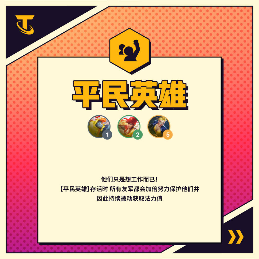 如果有一名[平民英雄]存活,所有友军会每2秒回复一定法力值。