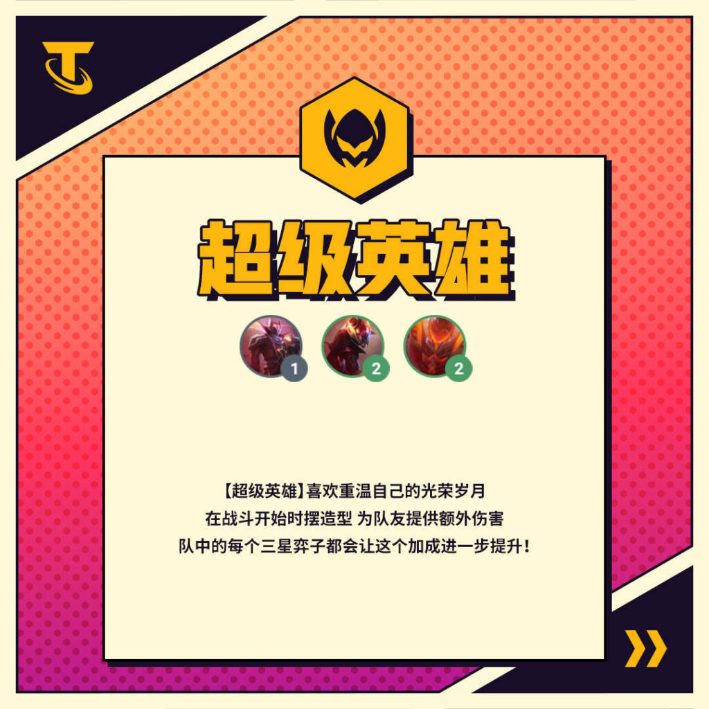 (3) 在战斗开始时,[超级英雄]会摆造型,为队友提供20%额外伤害。队伍中每有一个3星弈子,额外伤害会再提高6%。