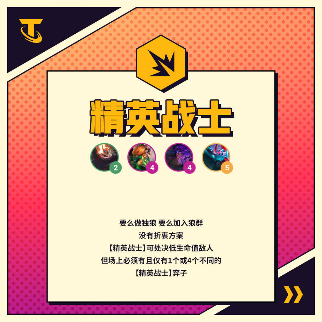 解析:这个羁绊的生成类似S1的忍者,只有1和4可以生效,斩杀生命值的敌人,1羁绊效果就非常不错了,特别像德莱文这些低费卡,在前期打工能力非常强。后期厄运小姐、莎弥拉、莫德凯撒这些大C开出4王牌也能够打出成吨的伤害。