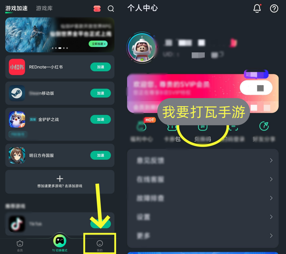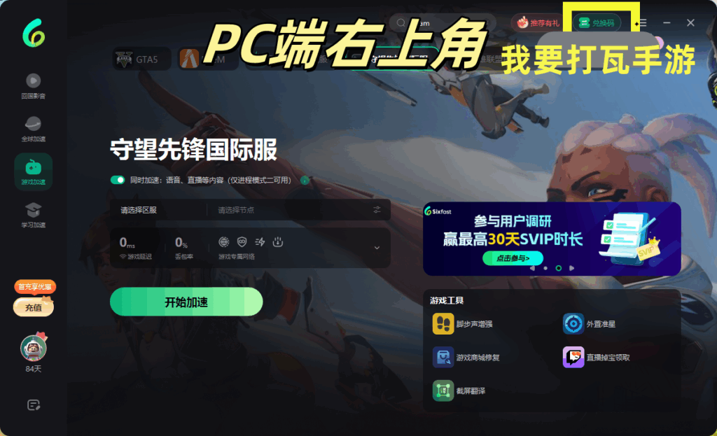 填写兑换码【我要打瓦手游】,随后按照右侧的流程完成 Sixfast 的注册登录,顺利领取72h时长。