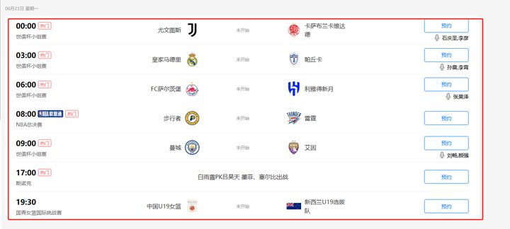 - 6 月 23 日:00:00,尤文图斯 vs 卡萨布兰卡维达德;3:00,皇家马德里 vs 帕丘卡;6:00,萨尔茨堡 vs 利雅得新月;9:00,曼彻斯特城 vs 艾因。