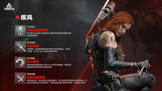 疾风是集高机动移动、缴械突入为一体的突击型干员。她可以在交战中可进行8个方向翻滚,并使用钻墙电钻缴械掩体后的敌人,在战斗时还可以在原地布置锚点,并可以主动将自己拉回锚点进行自救,让敌人难以捕捉。