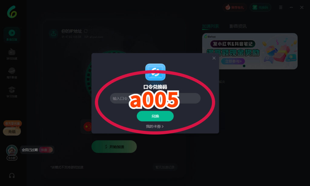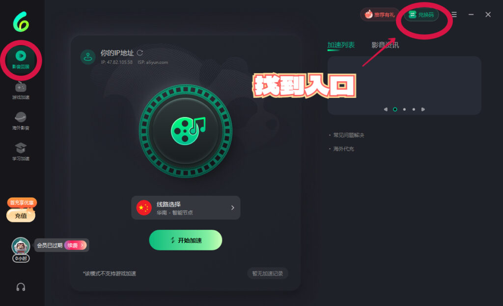 记得先兑换然后再左边找到【影音回国】-点击【开始加速】
