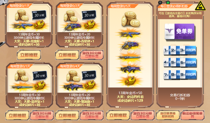 每日登录游戏即可有机会抽取史诗大奖和交易行免单券,每周最多可抽取5次,重置时间为每周00:00。当日游戏达到30分钟可获得1次补签机会,每周最多补签2次。