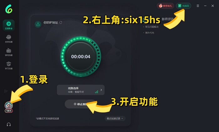 Sixfast应用下载注册后右上角找到兑换码,输入six15a就能获得72小时使用时间,记得先兑换才能正常使用