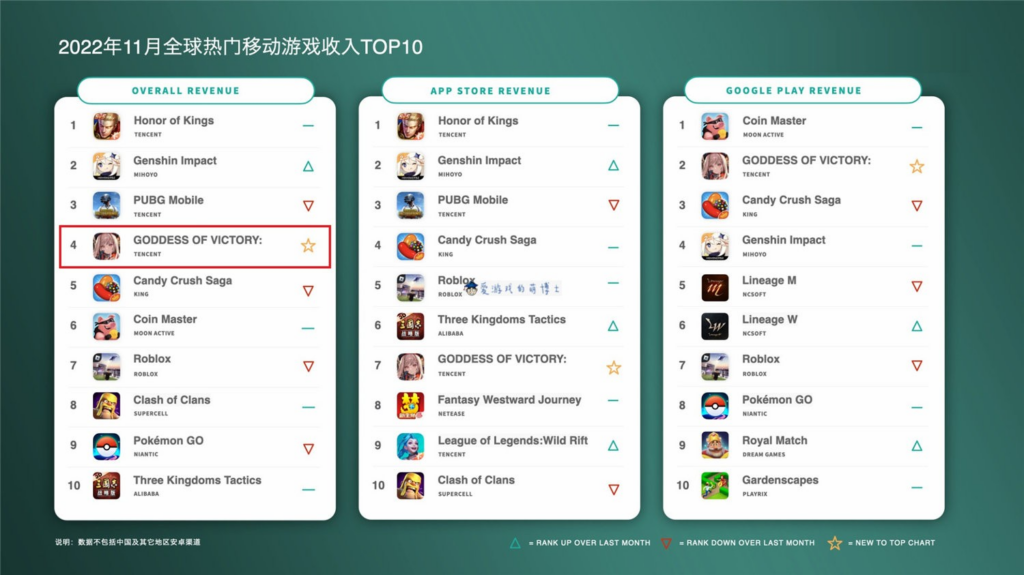 海外第三方数据公开了2022年11月全球手游畅销榜情况,榜单基本都是我们熟悉的老面孔,但也出现了新产品,妮姬胜利女神凭借1亿美元左右的收入冲到了第四名的位置,非常厉害,其中,日本玩家贡献的收入占了42.3%,紧随其后的是韩国(27.8%)和美国(15.5%),其独特的二次元美术风格以及有趣的战斗系统受到了大家的喜欢!值得一提的是:这款新人气游戏的发行商也是鹅厂,这意味着全球手游畅销榜TOP10中有四款游戏与鹅厂有关,不服不行呀!