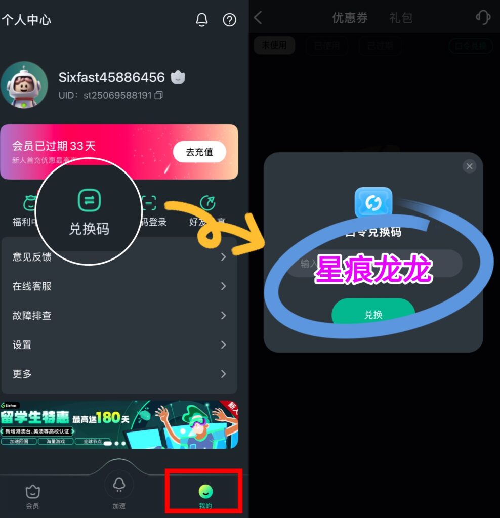 右上角角【兑换码】-输入【星痕龙龙】-领取免费时长!兑换完成后才可以加速!!!