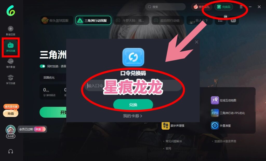 记得先兑换然后再左边找到【游戏加速】-上面搜索栏搜索【游戏名称】,一键加速!