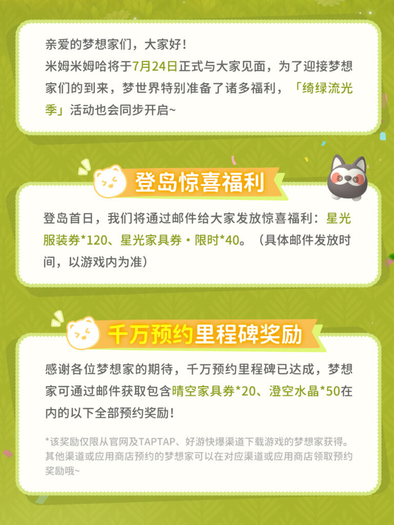 《米姆米姆哈》将于7月24日(本周四)10:00开启公测!各位梦想家们,期待已久的福利环节终于来了!