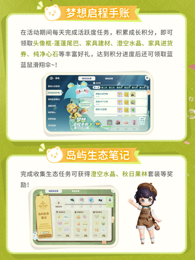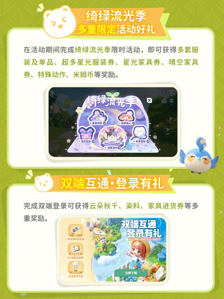 - 参与「绮绿流光季」活动,获得大量服装、家具、抽卡券及免费套装!