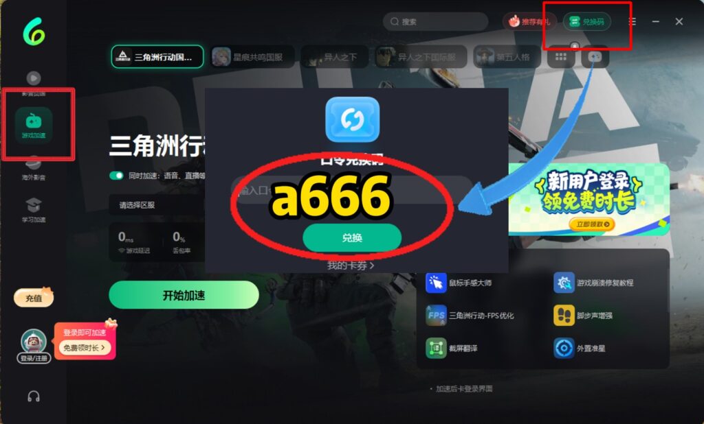 右上角角【兑换码】-输入【a666】-领取免费时长!兑换完成后才可以加速!!!