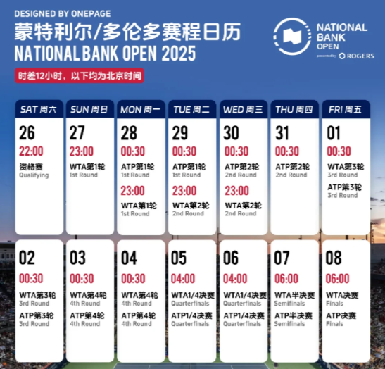 一、WTA蒙特利尔和ATP多伦多网球赛赛程日历