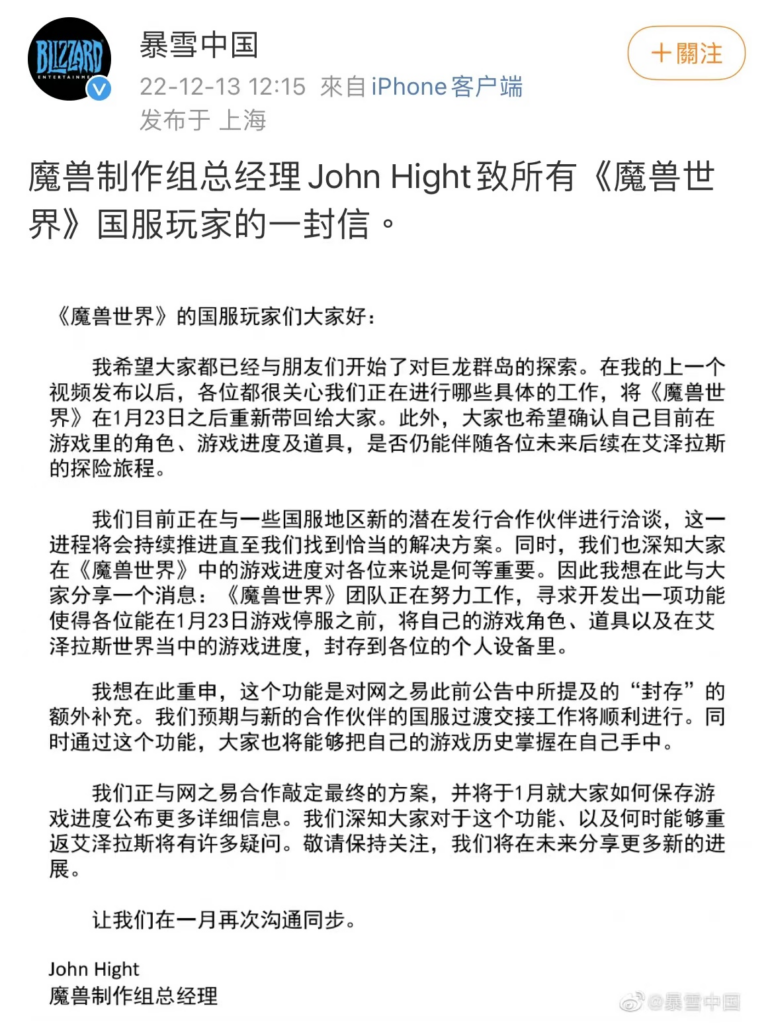 但就在今天(12月13日)传来了好消息,据暴雪中国官方微博,暴雪中国发布魔兽制作组总经理John Hight致所有《魔兽世界》国服玩家的一封信。