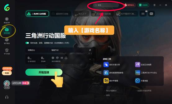 记得先兑换然后再左边找到【游戏加速】-上面搜索栏搜索【游戏名称】,一键加速!