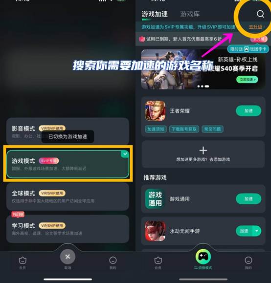 ②切记兑换完之后,才可以到下方切换模式,找到【游戏模式】,输入【游戏名称】,加速即可!