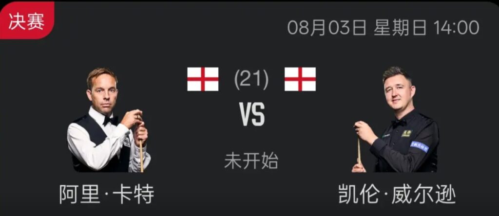 2025 年斯诺克上海大师赛将于 8 月 3 日迎来终极决战!世界排名第二的 “勇士” 凯伦・威尔逊将与 “逆转之王” 阿里・卡特展开 21 局 11 胜制的巅峰对决。这场决赛堪称斯诺克两代强者的宿命碰撞 —— 威尔逊作为 2024 年世锦赛冠军,本赛季状态火热;而 46 岁的卡特则以替补身份创造奇迹,连续三场逆转 TOP16 选手,成为赛事最大黑马。