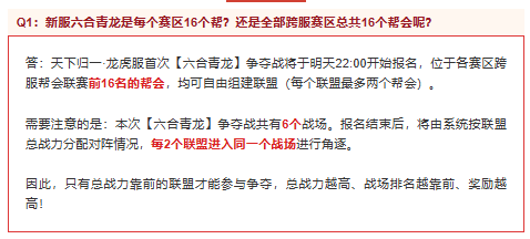 本周日(8月3日),全新活动【六合青龙】将在新服【天下归一·龙】和【天下归一·虎】首次开启。该活动面向所有赛区跨服帮会联赛前16名的帮会,现已开启报名。